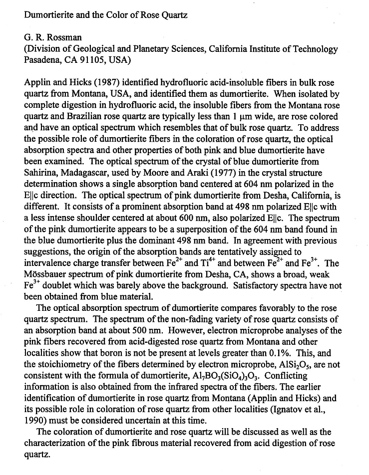 A9) Grew ES, Rossman GR (1976) Color and iron in Sillimanite (abstract). Physics of Minerals Session, International Mineralogical Association, at the 25th International Geological Congress, Sydney, Australia. 25th IGC, 2, 564-565. Absgract PDF