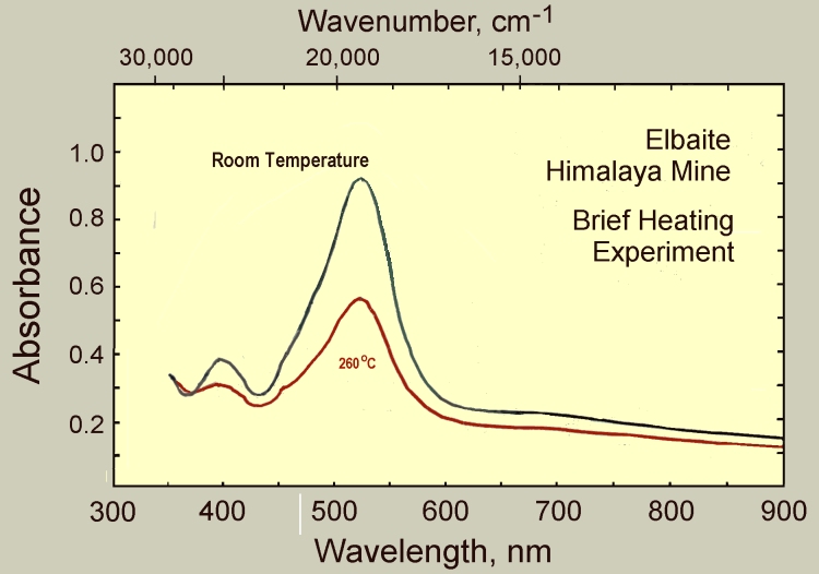 and represents a typical treated color for pink tourmalines. While stable at ambient temperatur, the some of the Mn3+ will be converted back to Mn2+ after brief, gentle heating. When heated to the temperature of initial crystallization, esentially all the pink color of Mn3+ is lost.